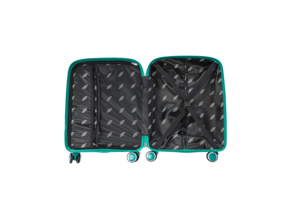Uvnitř kufru naleznete tradiční uspořádání – jedna část se uzavírá látkovou stěnou se zipem a síťovou kapsičkou a druhá část je zabezpečená popruhy. Pohodlné teleskopické madlo a čtyři dvojité otočné kolečka pro snadnou manipulaci.