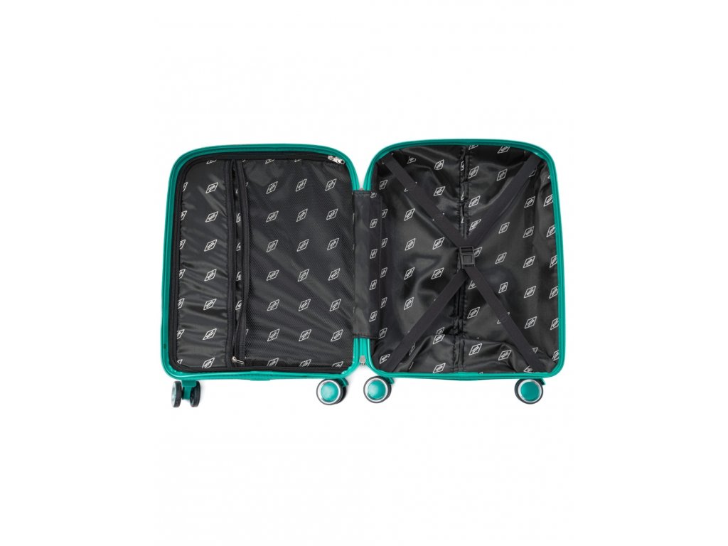 Uvnitř kufru naleznete tradiční uspořádání – jedna část se uzavírá látkovou stěnou se zipem a síťovou kapsičkou a druhá část je zabezpečená popruhy. Pohodlné teleskopické madlo a čtyři dvojité otočné kolečka pro snadnou manipulaci.