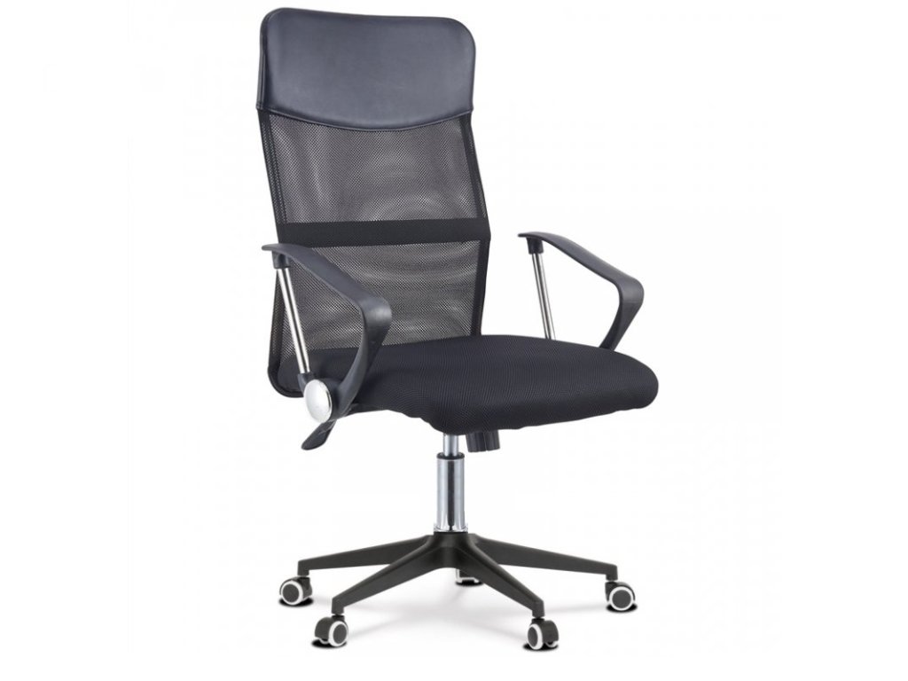 Kancelářská židle - otočná s houpací mechanikou, nosnost 120 kg, plochý sedák s nastavitelnou výškou, bederní opěrka, opěrák s nastavitelným sklonem, pevné područky, plastová kolečka, kovová konstrukce, materiál potahu textil, síťovina a syntetická kůže, šířka 61 cm, hmotnost 11 kg